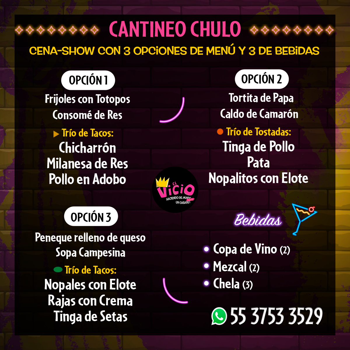 Recuerda que el costo del boleto presencial incluye cena y bebidas. Puedes consultar el Menú Cantinero haciendo clic aquí. Si deseas ordenar algo más de la carta, lo podrás hacer, pero para tu comodidad y seguridad, te pedimos por favor que hagas todos tus pagos con tarjeta de crédito, para no manejar operaciones en efectivo. Así nos mantenemos más seguras y seguros.